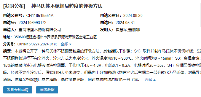 2024年8月20日,寶鋼德盛不銹鋼有限公司成功申請一項名為“一種馬氏體不銹鋼晶粒度的評級方法”專利,申請公布號為CN118518551A,申請日期為2024年5月31日。