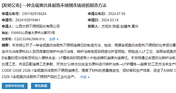 2024年7月5日,山西太鋼不銹鋼股份有限公司成功申請一項名為“一種含鈮奧氏體耐熱不銹鋼連鑄坯的制造方法”專利,申請公布CN118291842A,申請日期為2024年3月14日。