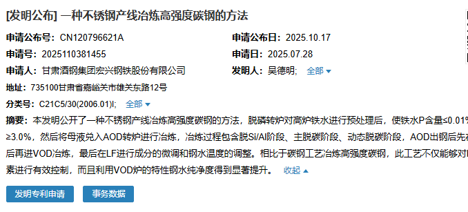 2025年10月17日,甘肅酒鋼集團(tuán)宏興鋼鐵股份有限公司成功申請一項名為“一種不銹鋼產(chǎn)線冶煉高強(qiáng)度碳鋼的方法”專利,申請公布號為CN120796621A,申請日期為2025年7月28日。