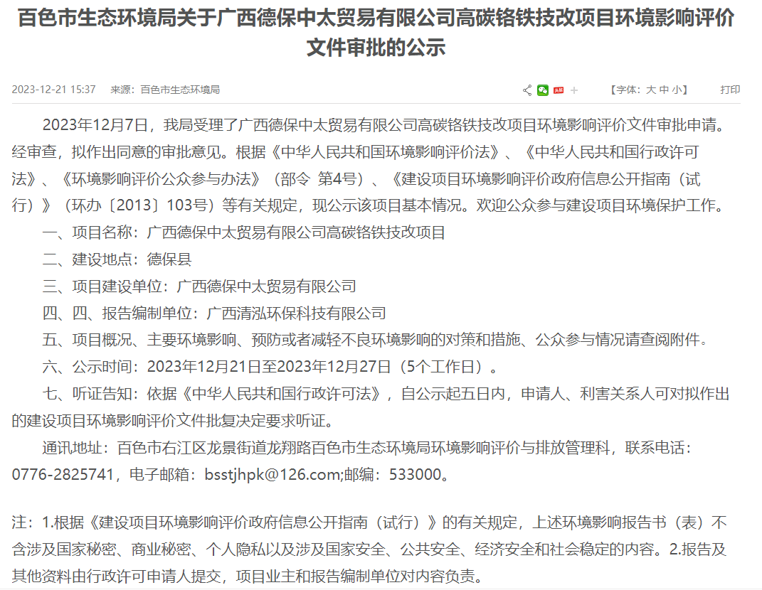 12月21日,百色市生態(tài)環(huán)境局就廣西德保中太貿(mào)易有限公司高碳鉻鐵技改項(xiàng)目環(huán)境影響評價文件作出審批意見并對外進(jìn)行公示,公示時間:2023年12月21日至2023年12月27日(5個工作日)。